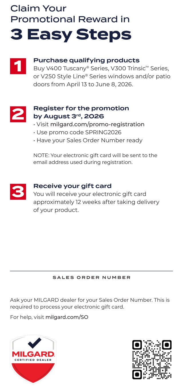 4. To qualify, register at milgard.com/promo-registration by August 3, 2026. Use Promo Code SPRING2026 and provide your Sales Order Number. Gift cards will be issued approximately 12 weeks after delivery or registration, whichever is later. Registrations submitted after 11:59pm PST on August 3, 2026 will not be eligible.